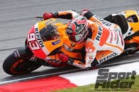 On a sweltering hot Saturday at the Sepang circuit in Malaysia, Repsol Honda’s Marc Marquez took his record 13th MotoGP pole position for 2014, smashing his own lap record from last year and breaking the two-minute-lap barrier on the picturesque circuit with a 1:59.791 lap. With ambient temperatures hovering around 95 degrees F and track temps reaching 136 degrees F, it was a tough day for both riders and bikes, with Marquez, Valentino Rossi, and Pol Espargaro all suffering crashes in the previous practice sessions. The Repsol Hondas seemed to be in a class of their own, as Marquez’s teammate Dani Pedrosa also broke the two-minute barrier with a 1:59.973 to take second position on the grid. Movistar Yamaha’s Jorge Lorenzo pushed to the absolute limit to stay with the Hondas and was successful in staying on the front row, albeit running almost half a second behind Marquez’s lap time and unable to break the 2:00 mark.